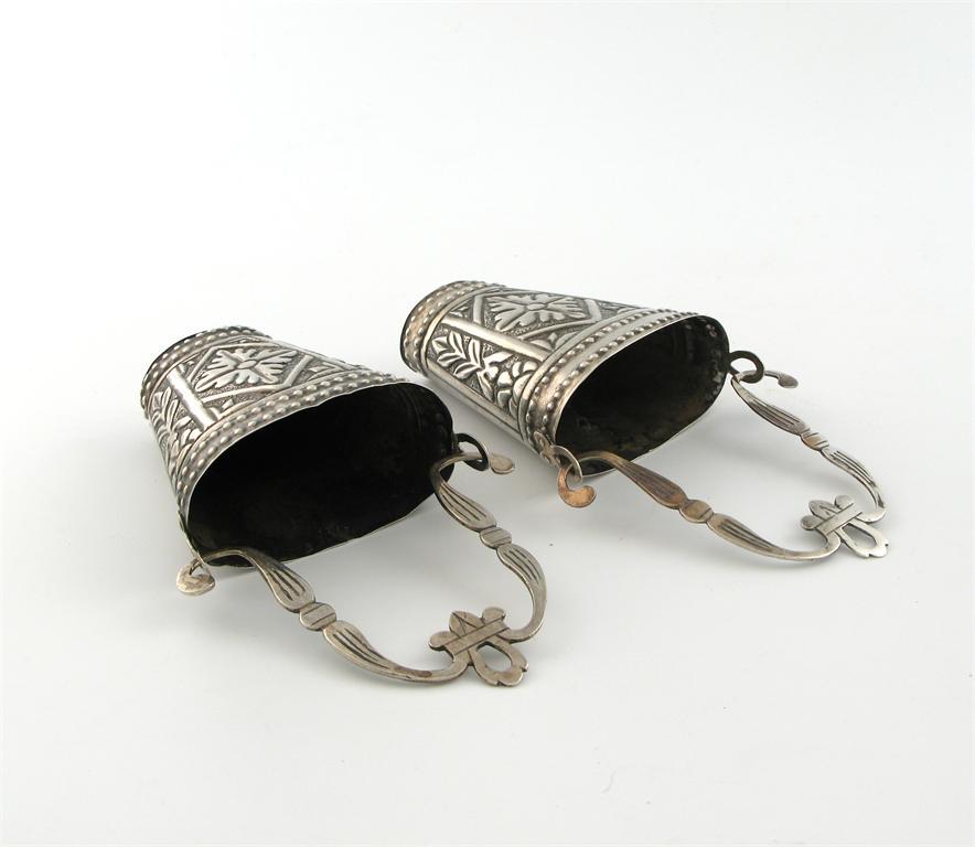 A pair of Spanish silver holy water stirrups, tapering oval form, embossed foliate decoration, beaded borders, swing handle, length 16cm, approx. weight 4oz. (2)