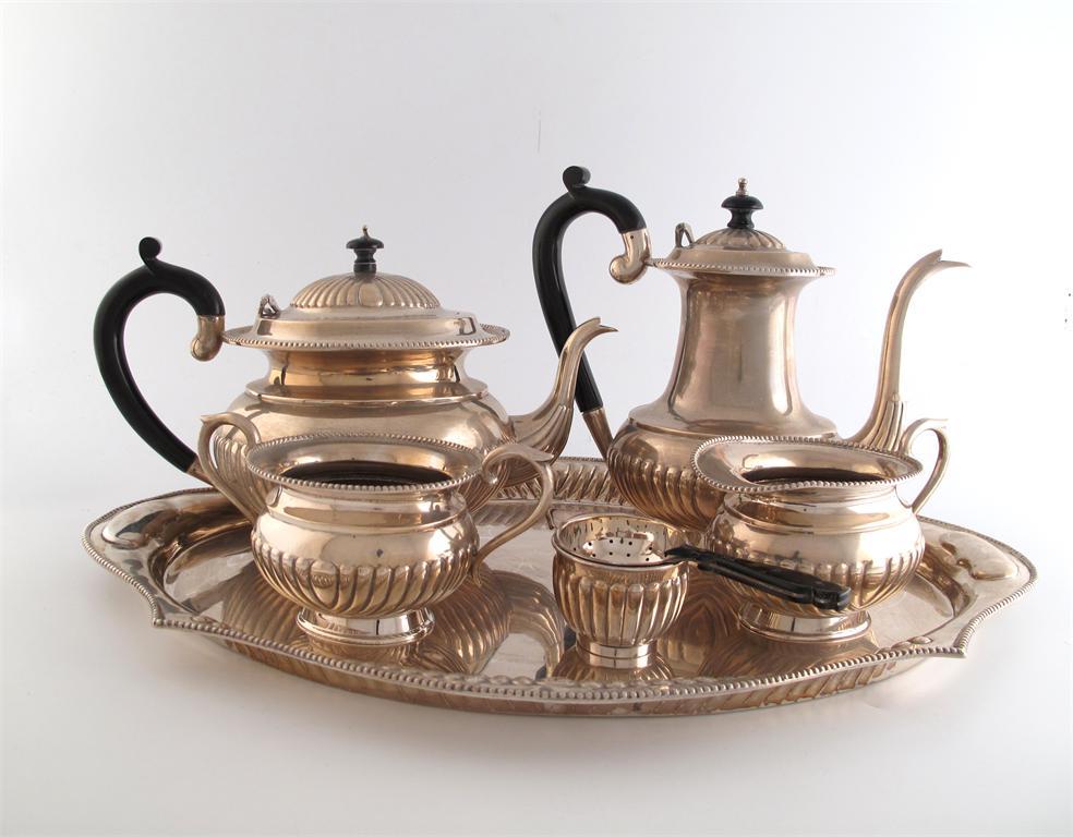 in the English taste, of oval form, part fluted decoration, scroll handles, and domed hinged covers, beaded borders, the tray of shaped oval form, length 4.8cm, approx. weight 118oz. (6)