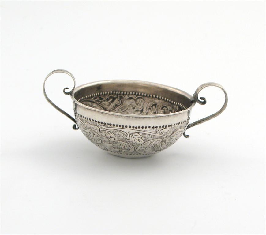 A small Scandinavian silver two-handled bowl, maker's mark of I.P, circular form, chased foliate decoration, scroll handles, diameter 6cm, approx. weight 0.8oz.