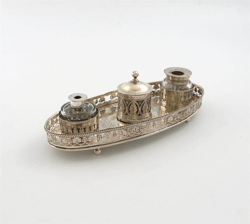 A 19th century Italian silver inkstand, maker's mark of G.B, oval form, pierced foliate gallery, bright-cut decoration, with a central pot, and two inkwells, one with a later cover, the whole on four ball feet, length 20cm, approx. weight 6oz.