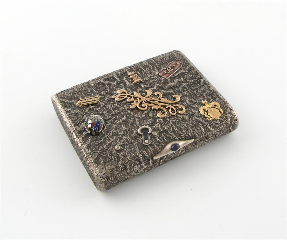 A Russian silver cigarette case, bearing pseudo Fabergé marks, rectangular form, textured body applied with silver and enamel and gold charms, flush hinged cover, length 10.7cm, approx. weight 7oz.