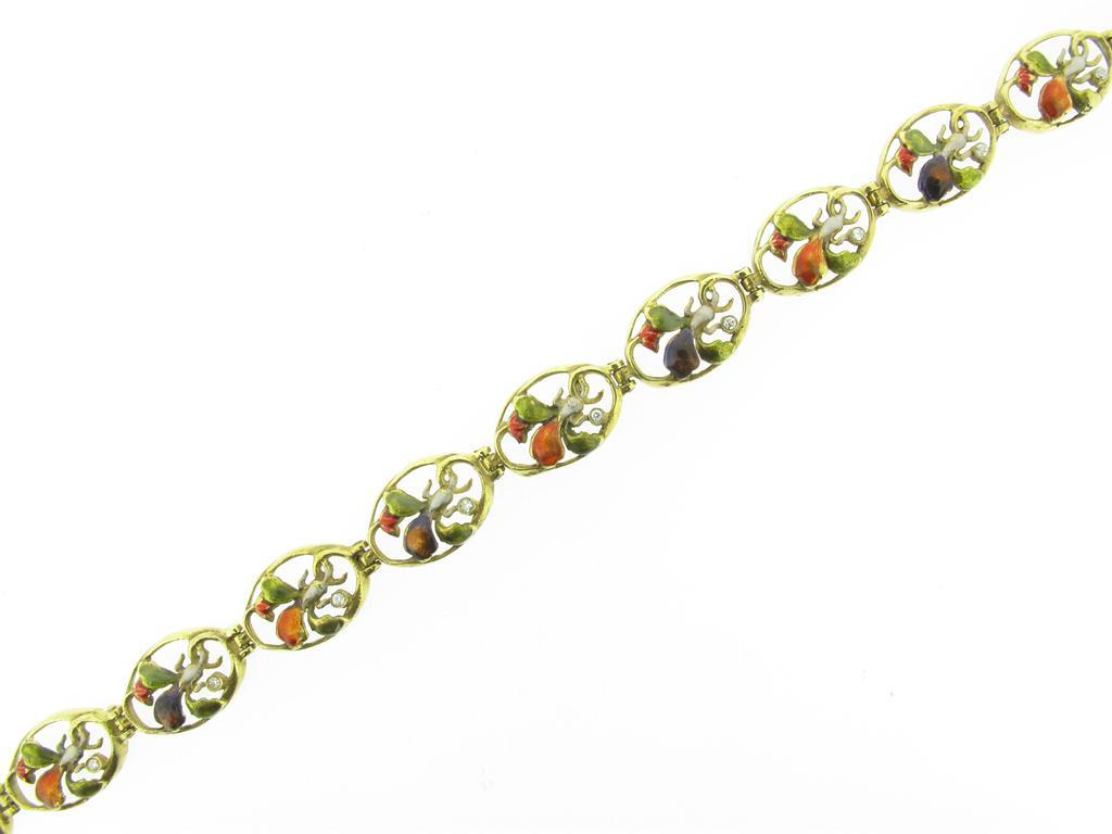 An Art Nouveau gold bracelet. Each foliate link with enamel decoration and set with a small circular cut diamond. 18.5cm long.
