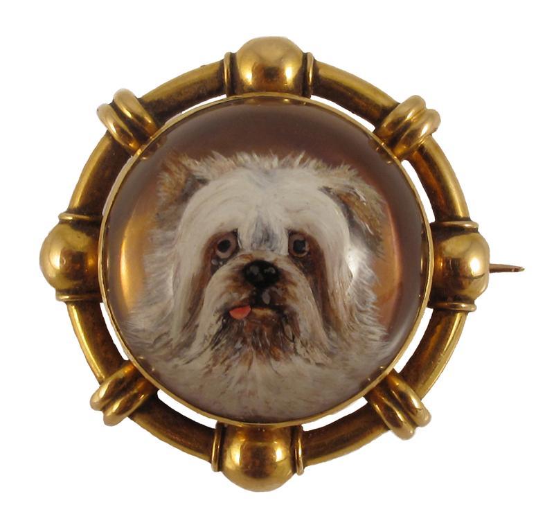 A 19th Century gold brooch, mounted with a reverse carved crystal depicting a dogs head. The crystal surrounded by a gold ships wheel. 2.6cm wide.