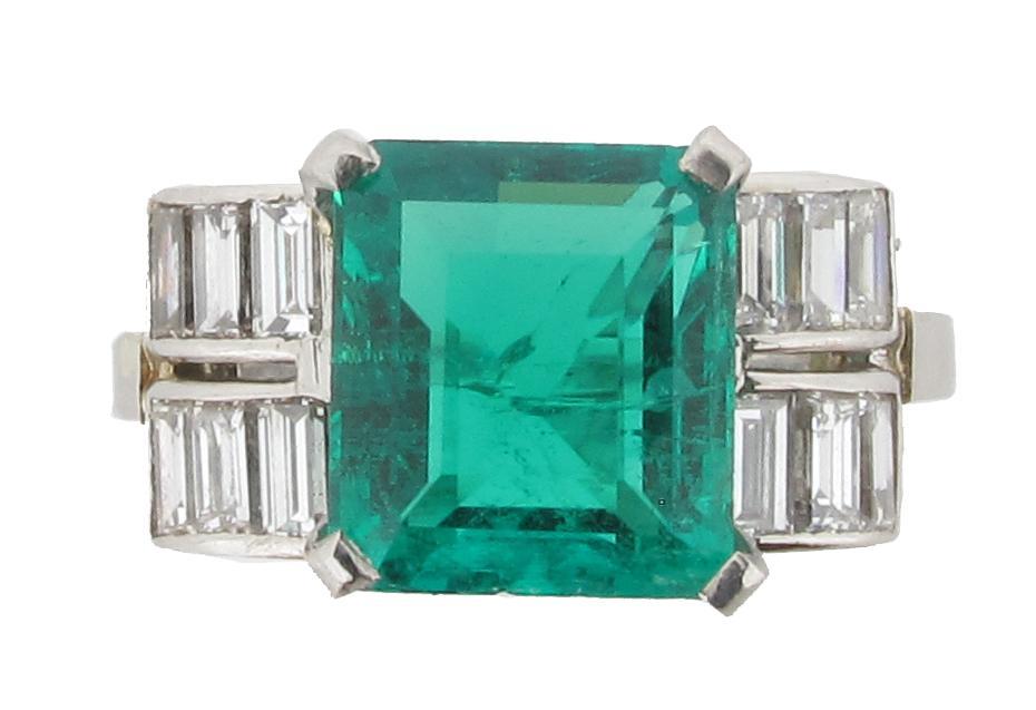 A French emerald and diamond ring. The rectangular shaped emerald is set with two rows of twelve shoulder baguette shaped diamonds in platinum. With obscured makers mark and French control mark. Platinum, size I 1/2.