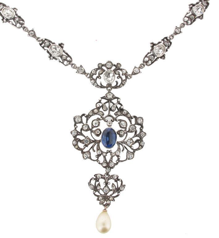 A George III paste set necklace. Of scroll design and set with white and blue pastes on silver. Artificial pearl drop.