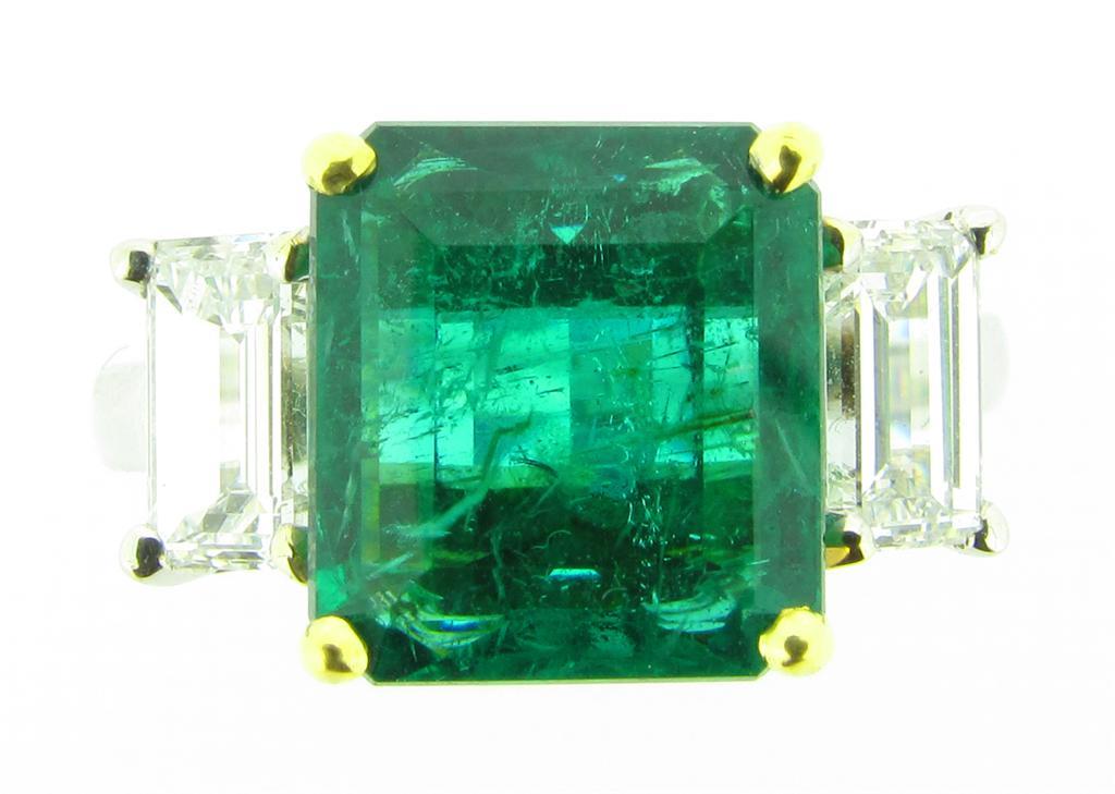An emerald and diamond three stone ring. The square shaped emerald is set with two baguette shaped shoulder diamonds in white gold.