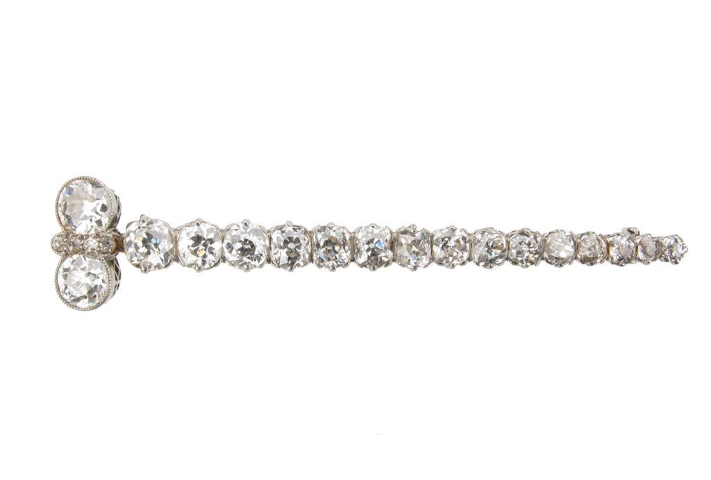 A diamond bar brooch. Set with a line of graduated old circular cut diamonds and with two larger diamonds to one side. Set in platinum. 7cm long.