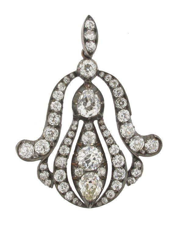 A Victorian diamond pendant. Set overall with graduated diamonds in silver and gold. The three principle diamonds weigh 2.60 carats in total.