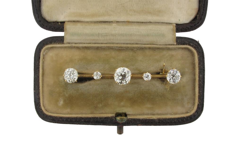 A diamond bar brooch. The three principle diamonds weigh 2.20 carats and are set in gold. Case.