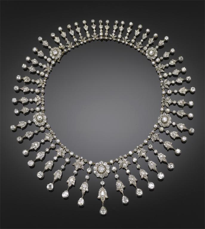 An impressive late Victorian diamond fringe necklace. Mounted with five graduated diamond...