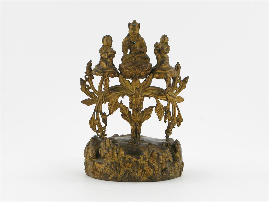 A rare Tibetan gilt bronze group, with the central figure of the Great Adept Padmasambhava seated in dhyanansana, on a lotus throne holding a vajra and patra, his consorts Mandarava, a Bengali princess and Tsogyal a Tibetan queen to his right and left respectively, all raised on an elaborate stand, 15th/16th century, 21.5cm. (3)