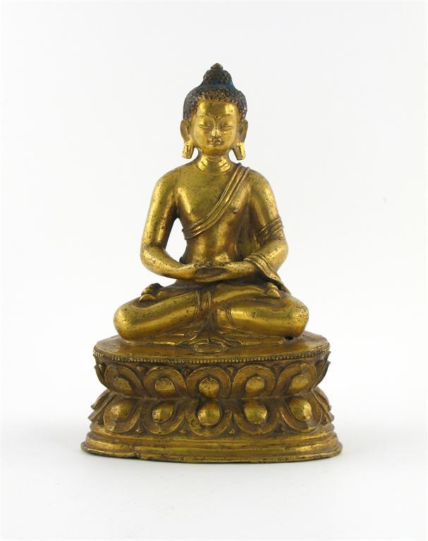 A Tibeto-Chinese gilt bronze figure of Amitayus Buddha, seated in dhyanasana on a lotus throne, 17th / 18th century, 23cm.