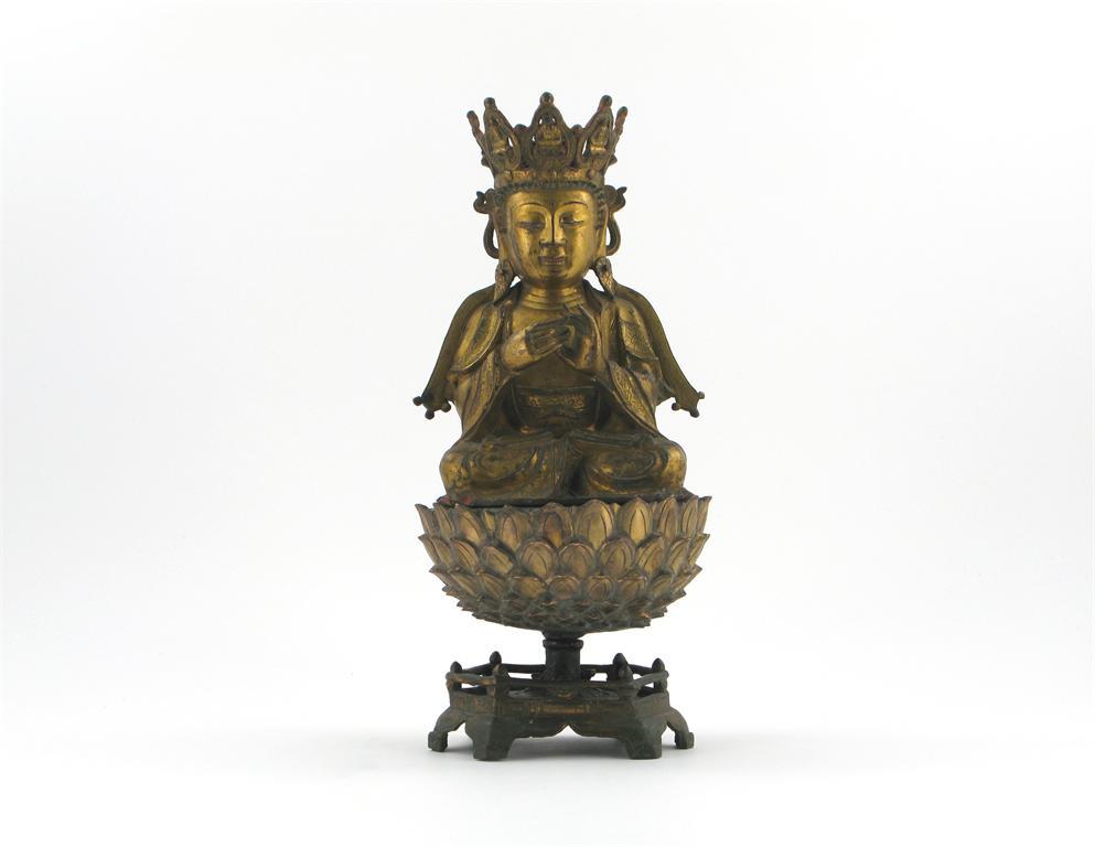 A Chinese gilt bronze figure of Guanyin, seated in dhyanasana, his crown with images of Buddha in each segment, raised on a lotus throne, late Ming, some wear, the stand possibly associated, 36cm. (2)