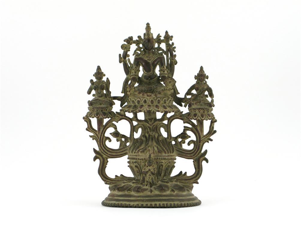 An Indian Pala-style bronze figure of Vishnu, with Sridevi and Bhudevi, seated in lalitasana mudra, with attendants on either side, and a devotee kneeling on the circular lotus petal base, 26.8cm. Provenance: Ernest Ohly collection.