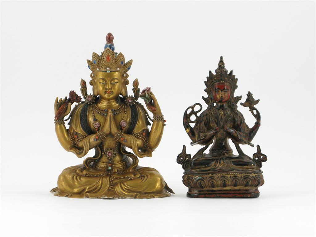 Two Chinese figures of Sadaksari, one in bronze and lacquered in black, red and gilt, the other porcelain, decorated in gold and polychrome, the latter with a moulded seal mark, 18th century and later, some damages, 23cm max. (2)