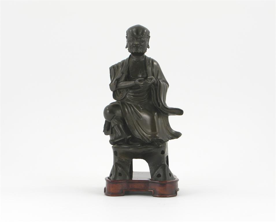 A Chinese bronze model of a seated lohan, wearing flowing robes and with his right foot upon a serpent, 17th century, 20cm. Together with a wood stand. (2)