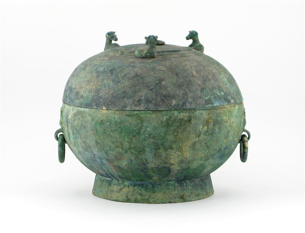 A Chinese bronze ting, or bowl and cover, with ring handles to the sides and three ram finials encircling a loose ring handle, the body finely incised with geometric designs and a running horse to the rim, probably Han dynasty, 28.5cm. (2)