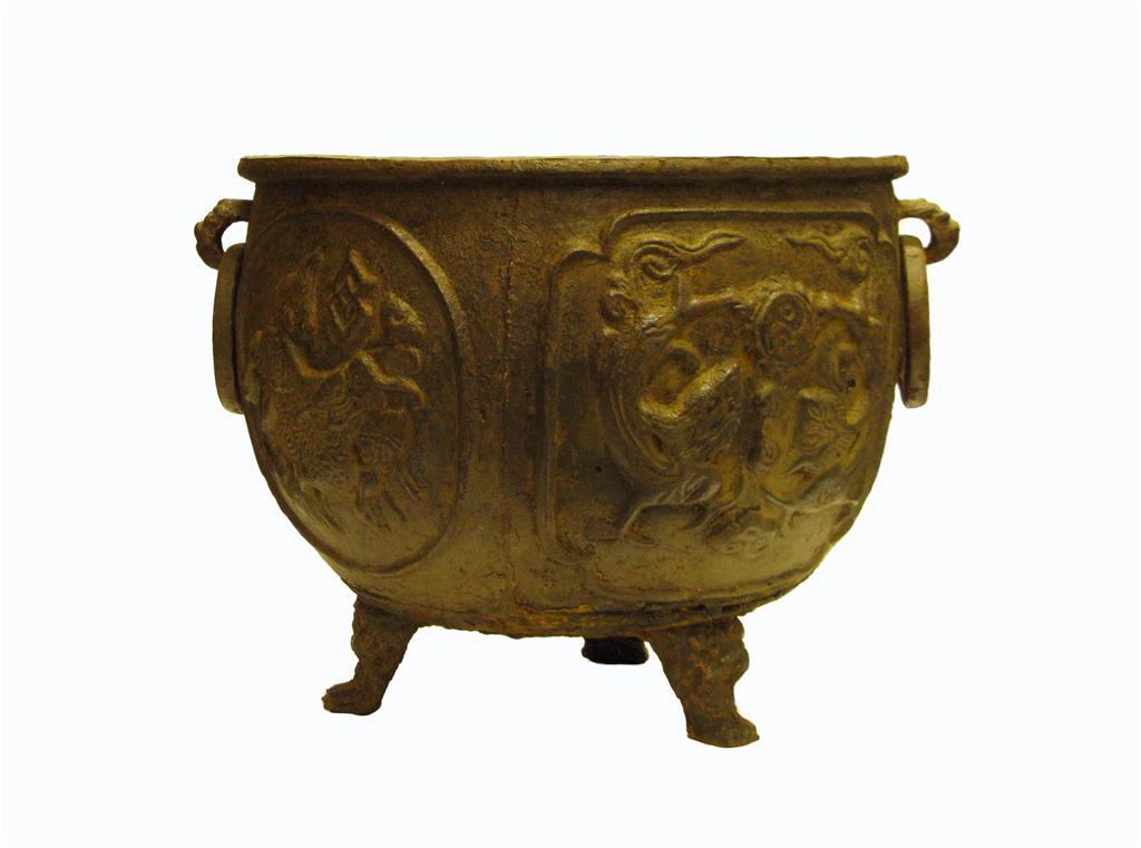 A Massive Chinese iron censer, the circular body with loose ring handles and cast in relief with four panels depicting fabulous animals and auspicious symbols, Ming dynasty, 61cm.