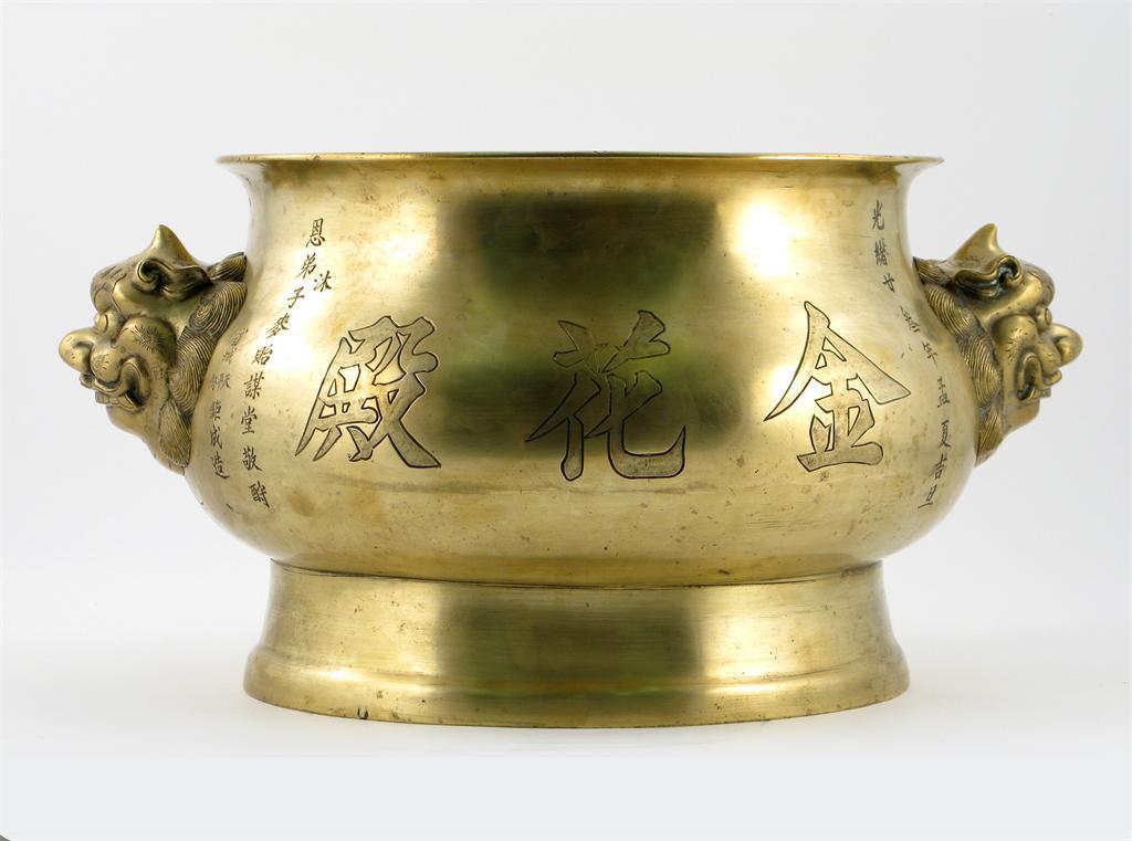 A massive Chinese bronze incense burner, dated 1897, the compressed circular body heavily cast with animal mask handles, one side decorated with three large characters between lines of calligraphy including for the emperor Guangxu, 48cm.