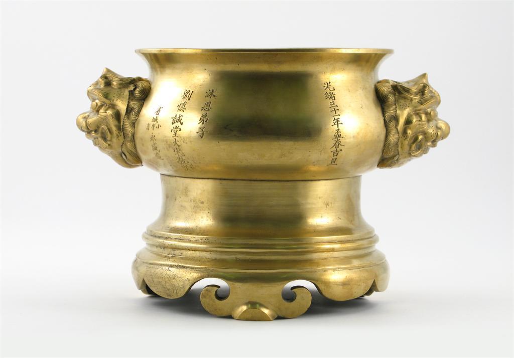 A massive Chinese bronze incense burner, dated to 1906, heavily cast with a compressed circular body and animal mask handles, raised on a turned base cast with ruyi head feet, the body with four lines of calligraphy including for the emperor Guangxu, 33cm across.