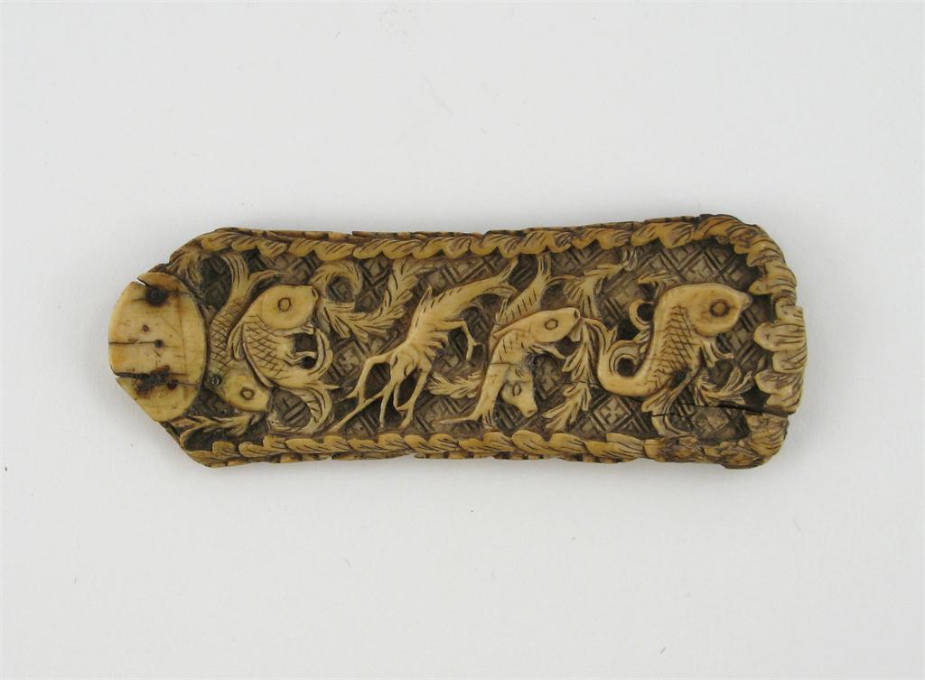 A Chinese carved ivory fan handle, decorated with fish, crustaceans and sea shells, Song dynasty 960-1279 AD, damages, 8.5cm. Cf. Jan Wirgin, Song Ceramic Designs.