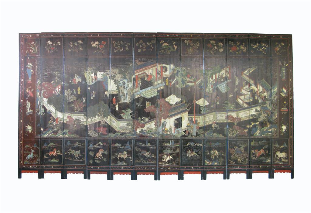 A large Chinese black lacquered coromandel twelve panel screen, carved in relief with landscapes and panels of flowers and animals, heightened in polychrome, 18th/19th century, 275cm high x 522cm wide.