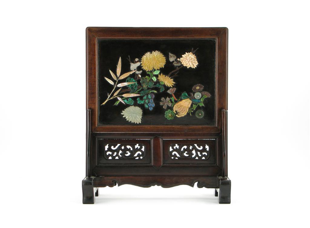 A Chinese black lacquer rectangular table screen, inset in jade, mother of pearl and ivory with flowering chrysanthemum and finger citron, the reverse with calligraphy and two seal marks in mother of pearl, mounted on a hardwood stand with reticulated panels, 18th century, 41.6cm. (2)