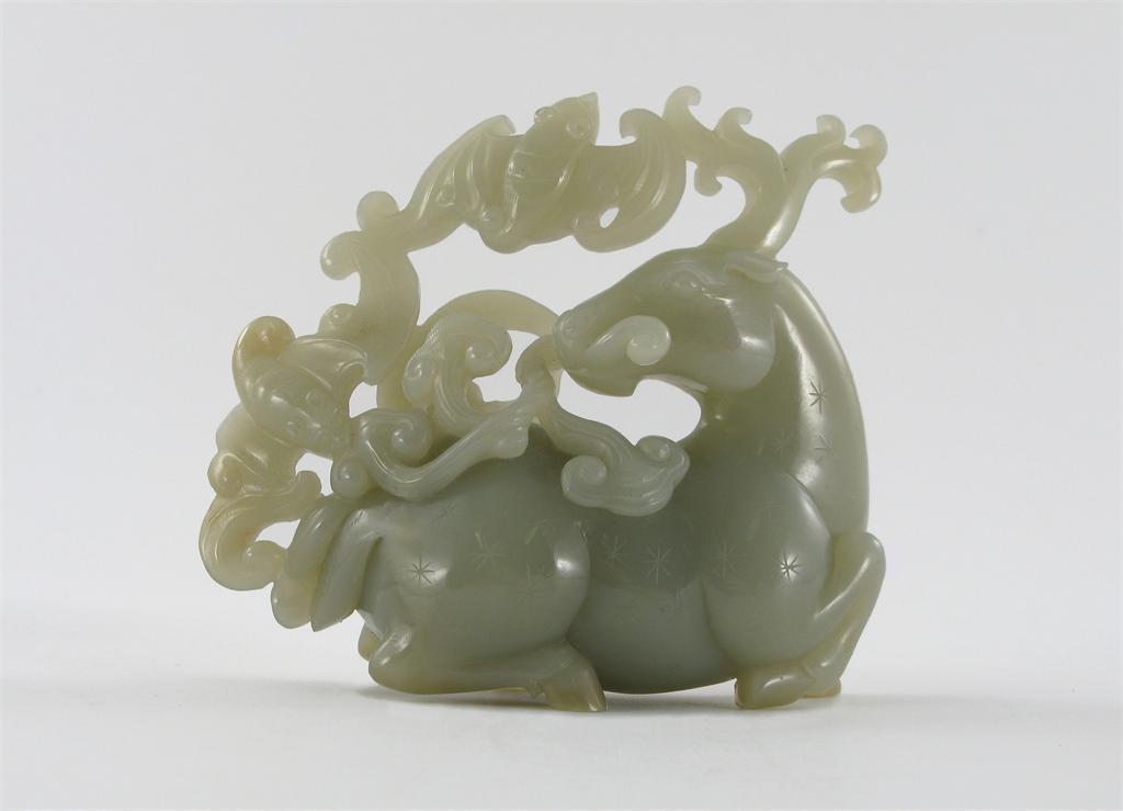 A Chinese pale celadon jade carving of a recumbent deer, his coat engraved with stars, his head turned and holding a ruyi stem, above which two bats are flying, 13.5cm.