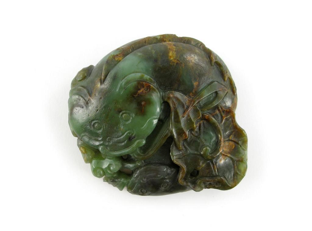 A Chinese spinach green jade carving of two catfish, amidst lotus, one with a ruyi fungus issuing from its mouth, 18th / 19th century, 8.5cm.