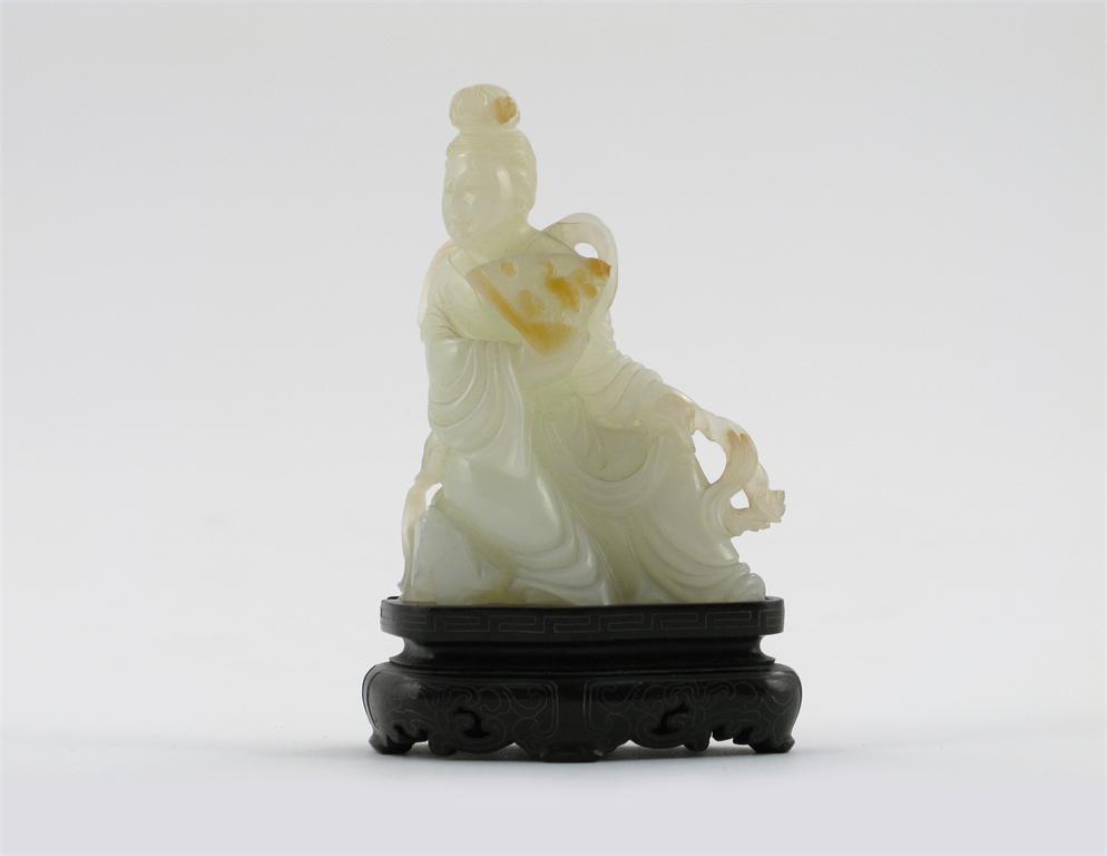 A small Chinese pale celadon jade carving of a seated lady, holding a fan, 18th / 19th century, 8.5cm. Together with a silver inlaid wood stand. (2)