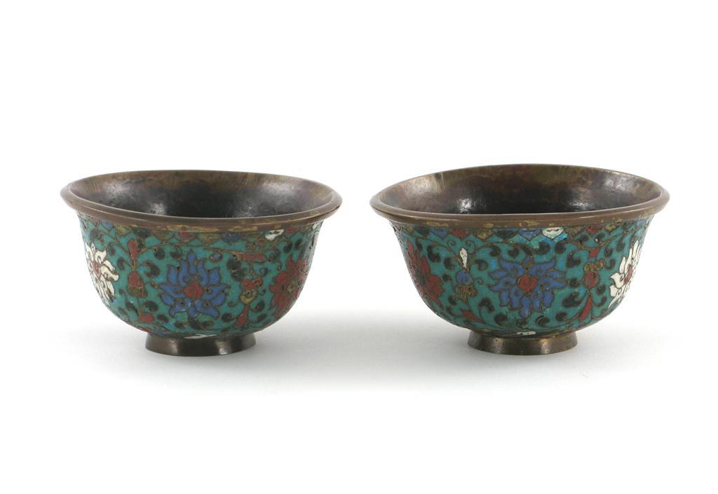 A pair of Chinese cloisonné bowls, decorated with lotus on a turquoise ground, 17th century, wear and dents, 10.5cm. (2)