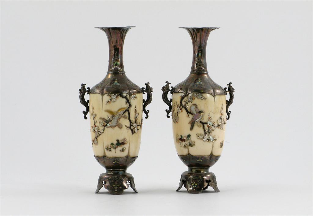 A pair of Japanese shibayama vases, the ivory bodies inlaid with mother of pearl and semi precious stones, with birds flying amidst prunus, flowers and foliage, the silver mounted neck and foot enamelled with flower sprays, both with a two character signature inside the foot, Meiji 1868-1912, some dents, 18cm. (2)