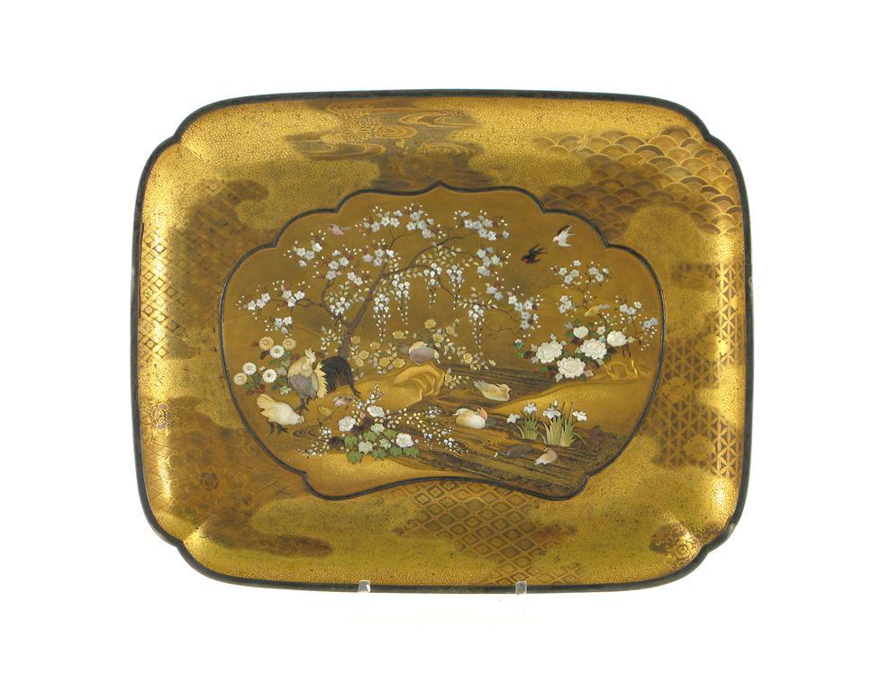 A Japanese gold lacquer rectangular tray, intricately decorated in mother-of-pearl with a cockerel, a hen and their chick, and with mandarin ducks and other aquatic birds around a rocky pool beneath flowering trees, the border with complex diaper and floral designs, a two character signature, Meiji 1868-1912, 30cm.