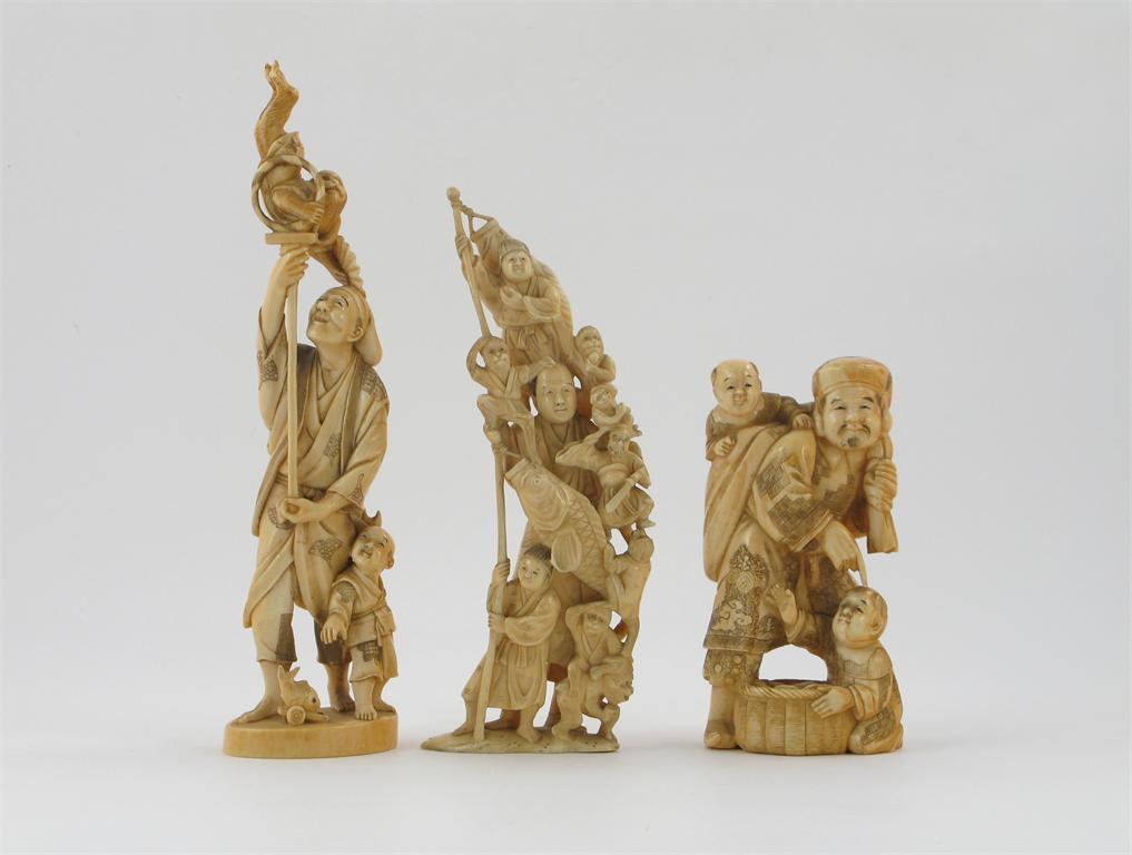 Three large Japanese ivory carvings, one of a man with two boys, the others of figures, children and monkeys, all signed, c.1900, minor faults, 28cm max. (3)