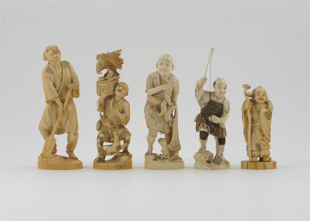 Five Japanese ivory carvings of figures, one holding a staff, three of fishermen, the fifth with a shovel, four with signatures, Meiji 1868-1912, damages, 17.4cm max. (5)