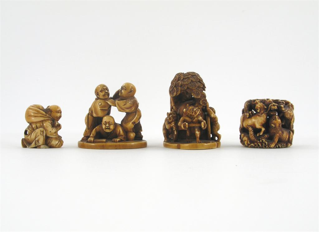 Four Japanese ivory carvings, one of three oni beneath a pine tree, three character signature, a carving of the animals of the zodiac with a two character signature, another of three struggling men with a red lacquer seal signature and a fourth of a crouching man with a large sack on his back, all Meiji 1868-1912, some damage, 5cm max. (4)