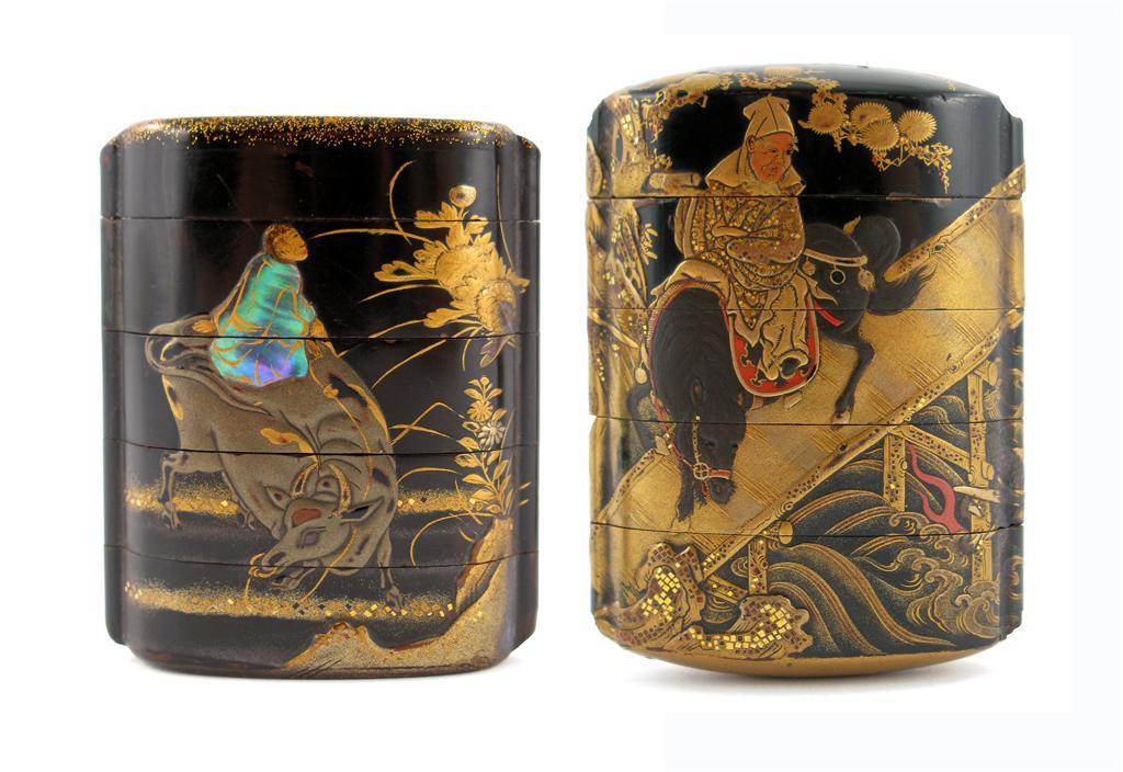 Two Japanese black and gold lacquer inro, one decorated with a figure of a horse and with a dragon amidst waves to the reverse, the other with a small boy riding an ox, 18th / 19th century, minor faults, 7.5cm max. (2)