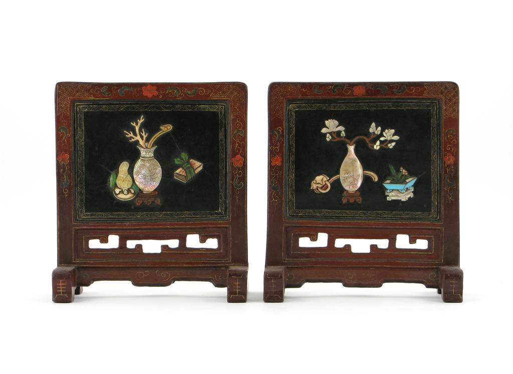 A pair of Chinese lacquer table screens, inset with mother of pearl and ivory and decorated with vases and auspicious objects, 19th century, 22.5cm.