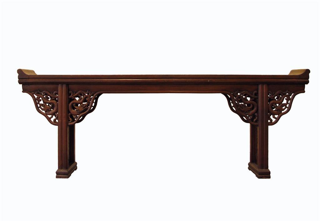 A Chinese elm wood altar table, with upright scroll ends, both sides carved with an openwork dragon frieze, late 18th / early 19th century, 224.5cm long.