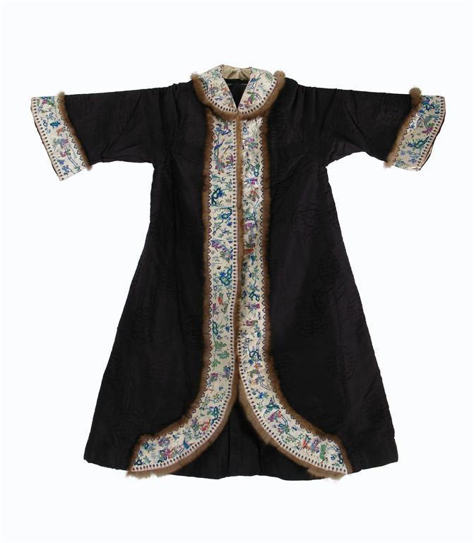 A Chinese silk coat, the indigo ground decorated with shou characters, the neck, sleeves and trims with brightly embroidered fur-lined borders. Together with a pair of detachable sleeves. (3)