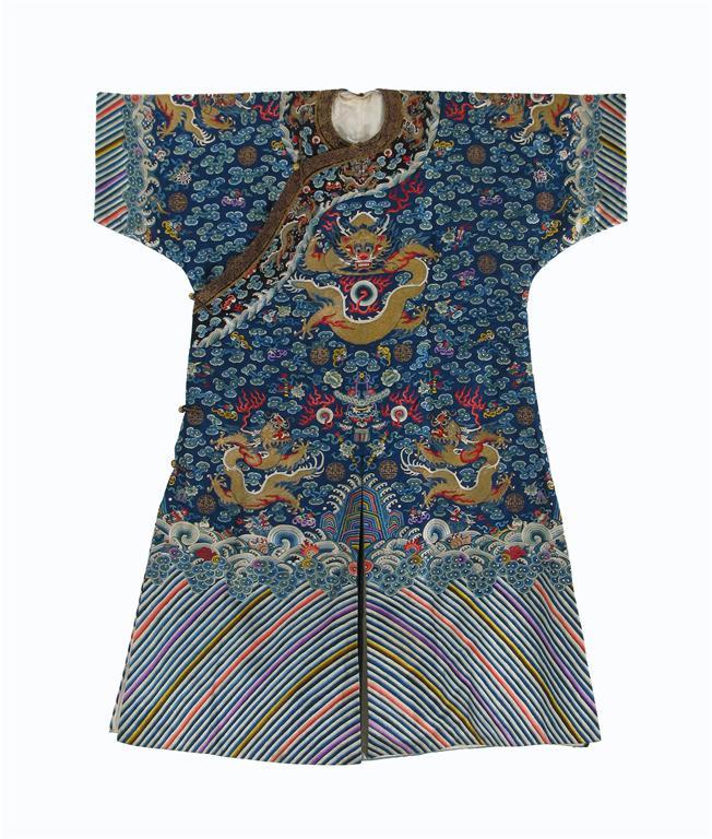 A Chinese silk blue ground surcoat, richly embroidered with dragons, bats, shou characters and auspicious objects amidst cloud scrolls, the lower section with breaking waves and vibrant stripes.
