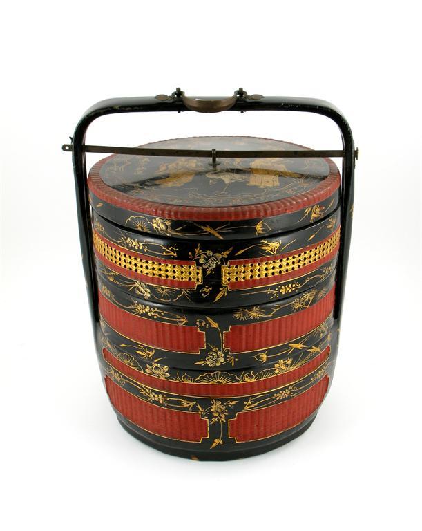 A red, black and gold lacquer cylindrical wedding basket, or ti lan, made in the Fuchow style, with three compartments and a cover, decorated with figures, birds and calligraphy, dated on the handle to the second year of Xuantong, corresponding to 1909, 51cm.