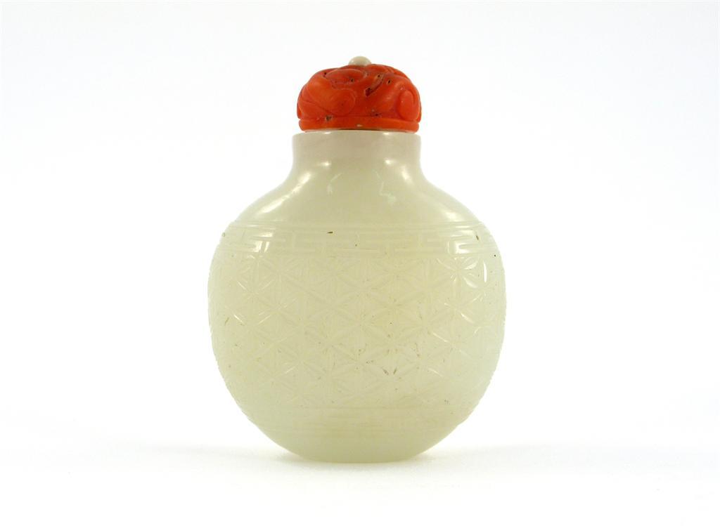 A Chinese jade snuff bottle, carved with a tied patterned sash around the body, with a coral stopper, 19th century, 7cm.