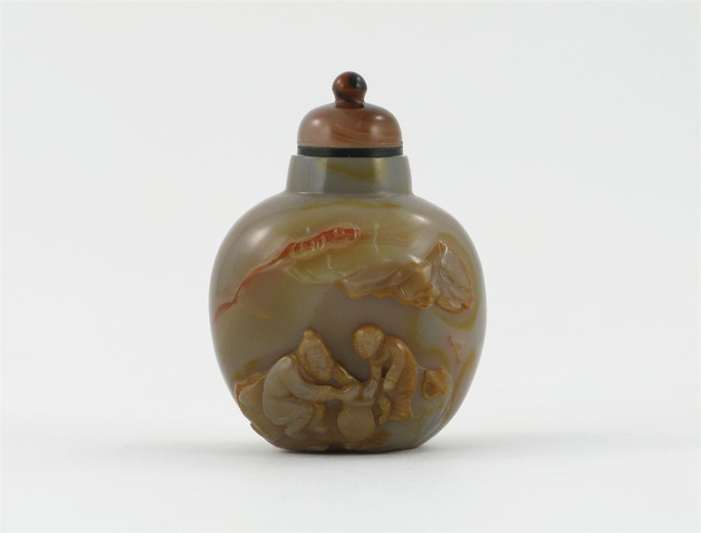 A Chinese agate snuff bottle, one side carved with an old man and a boy crouching over a vase, beneath rocks, 19th century, 7cm.