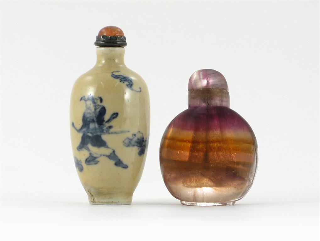 Two Chinese snuff bottles and stoppers, one banded amethyst, the other porcelain painted in blue with figures and bats on a café au lait ground, 18th/19th century, 8.5cm max. (2)