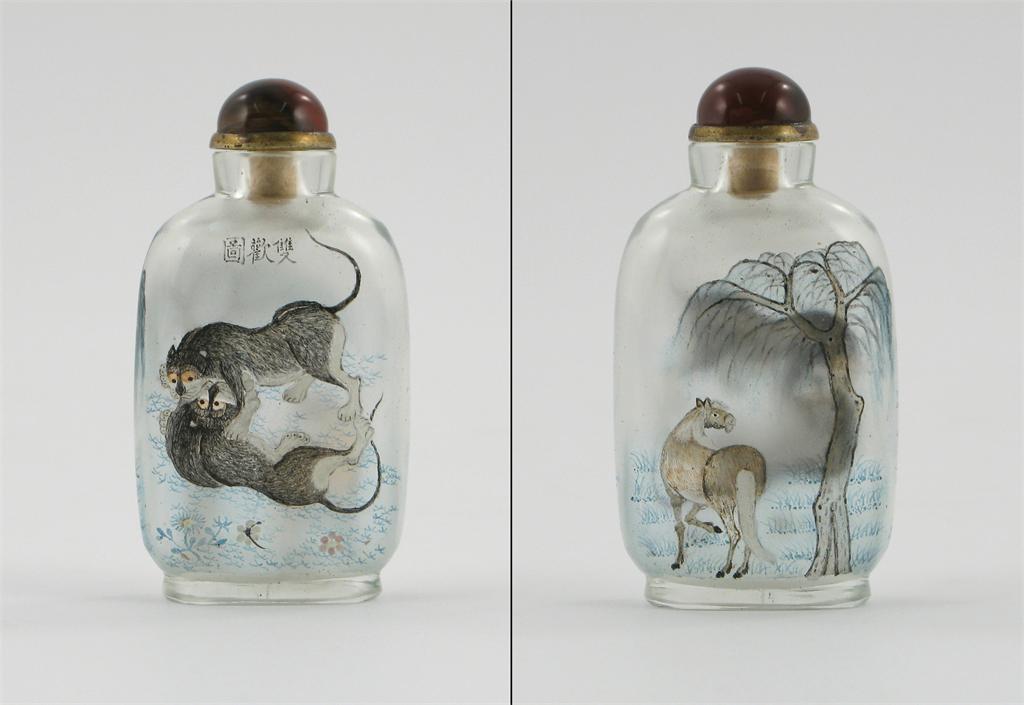A Chinese interior-painted snuff bottle, painted with a horse beneath a tree and two fighting cocks, unsigned but probably by Ma Shaoxuau, early 20th century, 6.7cm.