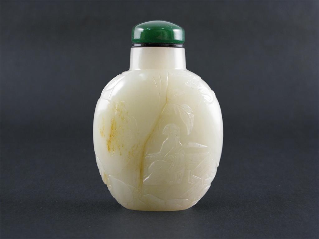 A good Chinese Suzhou school celadon jade snuff bottle, carved in relief with figures amidst rocks and with a flying crane, 18th century, 7cm.