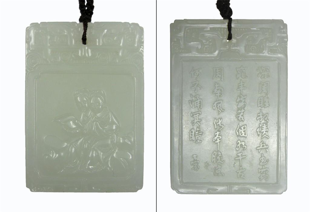 A Chinese white jade rectangular plaque, one side carved with two seated maidens, the reverse with four rows of calligraphy, 6cm.