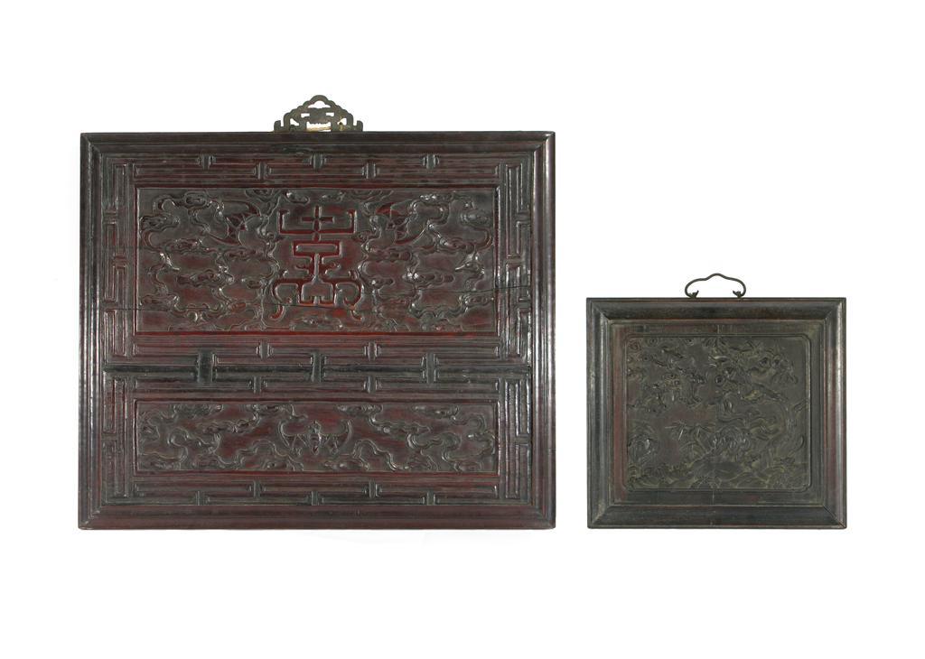Two Chinese hardwood panels, the smaller carved with three bats flying amidst fruiting peach branches, the larger carved to each side with zhou characters, one with bats and waves, the other flanked by dragons, 19th century, cracks, 65cm and 35cm. (2)