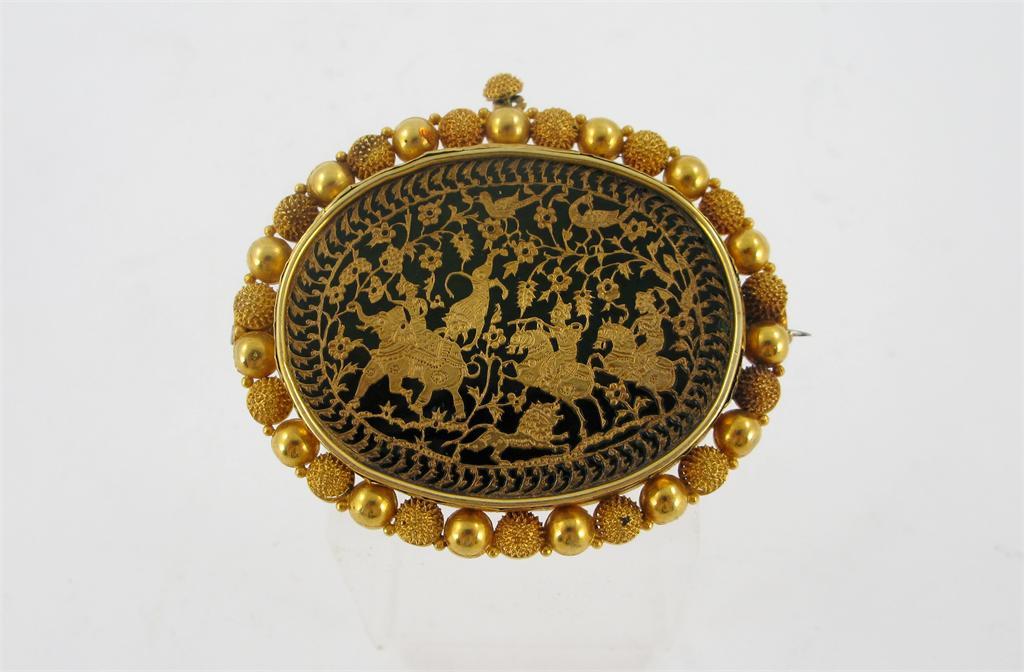 An Indian Pertabghar brooch pendant, of typical form depicting a tiger hunt amongst birds and foliage within an ornate yellow gold frame, 5.5cm. Cased.